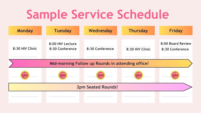 Please see the below schedules for sample inpatient and outpatient rotations.
